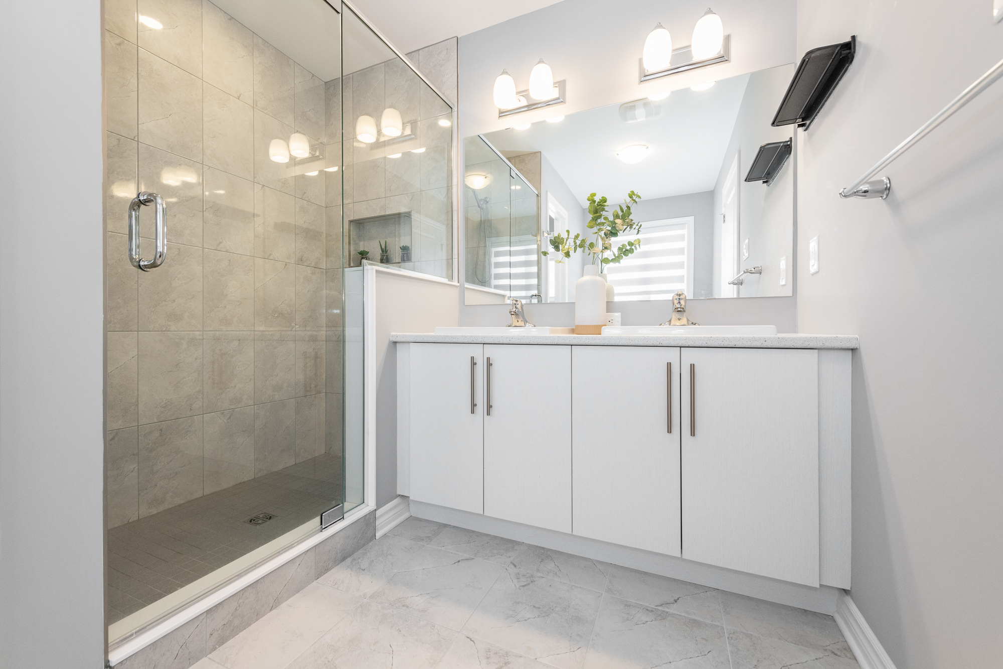 shower with niche, and peaceful pond views to start and end your day. The fully finished lower level adds